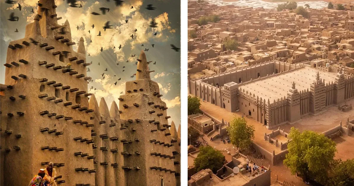 The largest mud‑brick mosque in the world with extraordinary silhouette and community presence. The Great Mosque of Djenné, first constructed in circa 13th century and rebuilt in 1907, stands as one of the most iconic examples of Sudano‑Sahelian architecture and a testament to the enduring ingenuity of West African Islamic communities. Built entirely of sun-baked mud bricks with intricately plastered façades and sculpted buttresses, its rhythmic pinnacles and timber scaffolding give the impression of a structure grown from the earth itself.