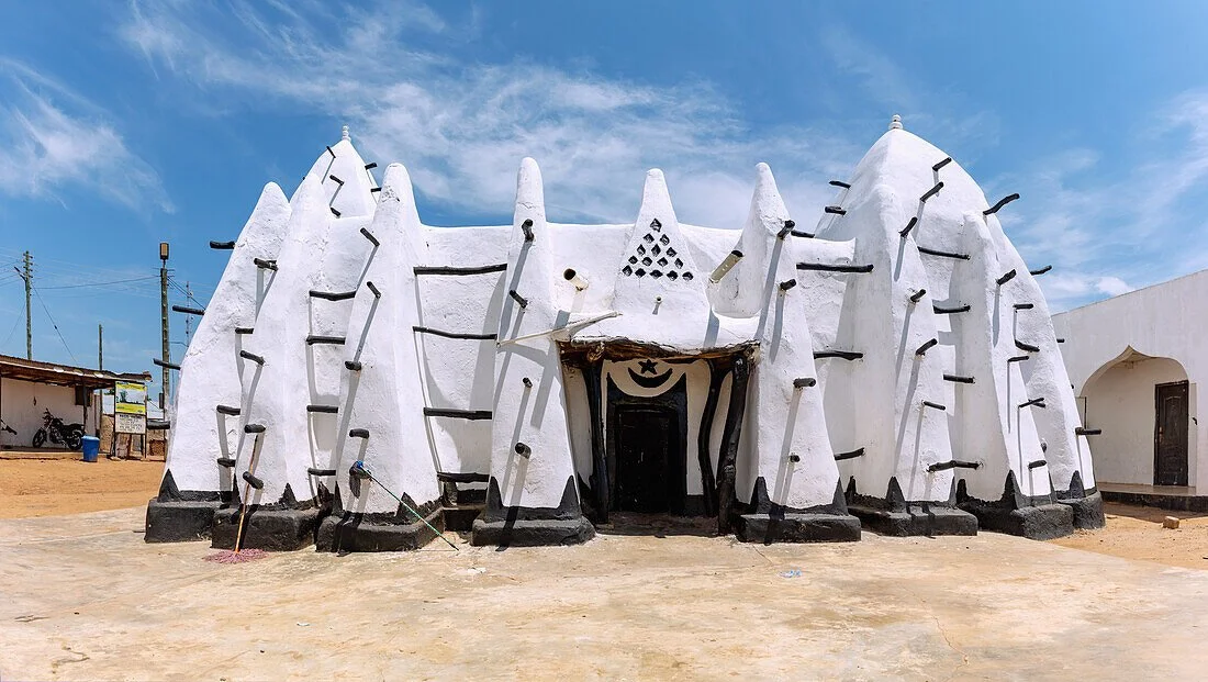 Built in 1421 CE, the Larabanga Mosque is widely considered one of the oldest mosques in West Africa, and without question one of its most hauntingly beautiful. Constructed in the distinctive Sudano Sahelian architectural style, its sculpted mud walls, tapered buttresses, and timber beams feel almost organic, as though the building rose naturally from the earth itself. Located in the village of Larabanga, near the edge of what is now Mole National Park, this mosque has long served as a spiritual anchor for travelers, traders, and local communities moving through ancient trans Saharan routes. Despite centuries of weathering and restoration, it remains deeply atmospheric, a place where time feels suspended and devotion is woven into every curve of clay.
